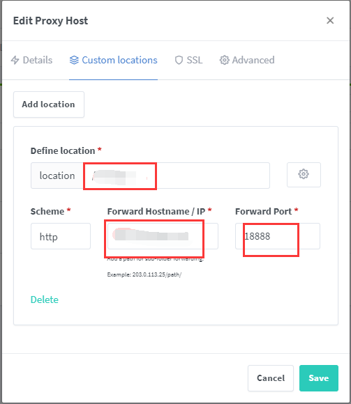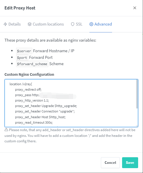 Custom locations中的location和X-UI中的面板 url 根路径一致,端口号是X-UI面板的端口