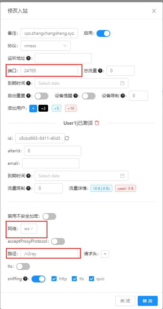 备注随便填写,协议、端口、id、路径根据自己的喜好填写,id需要唯一,可以点击 GUID 生成