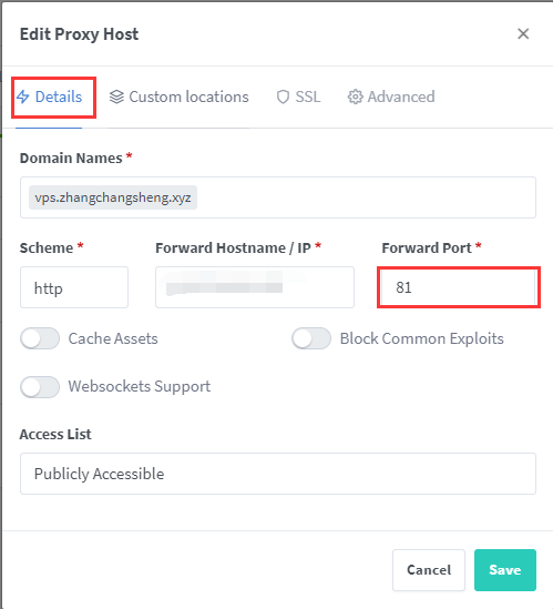 Detail中的IP是服务器的IP,端口号填写NPM的端口号81