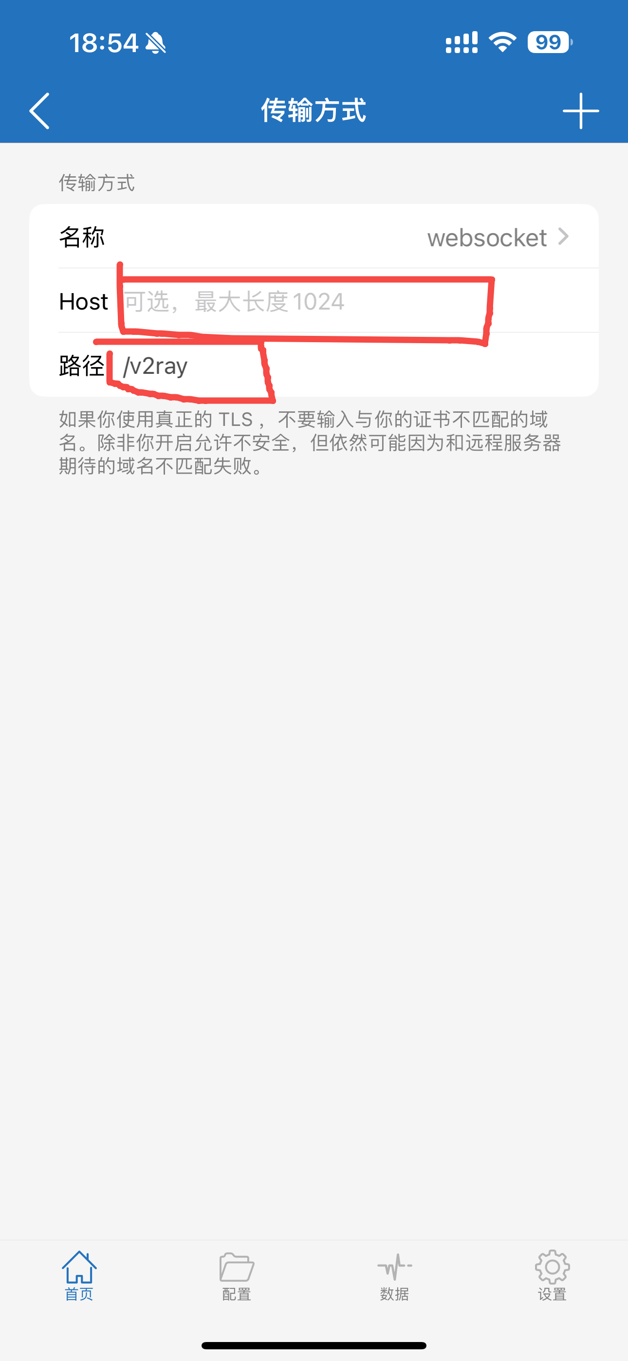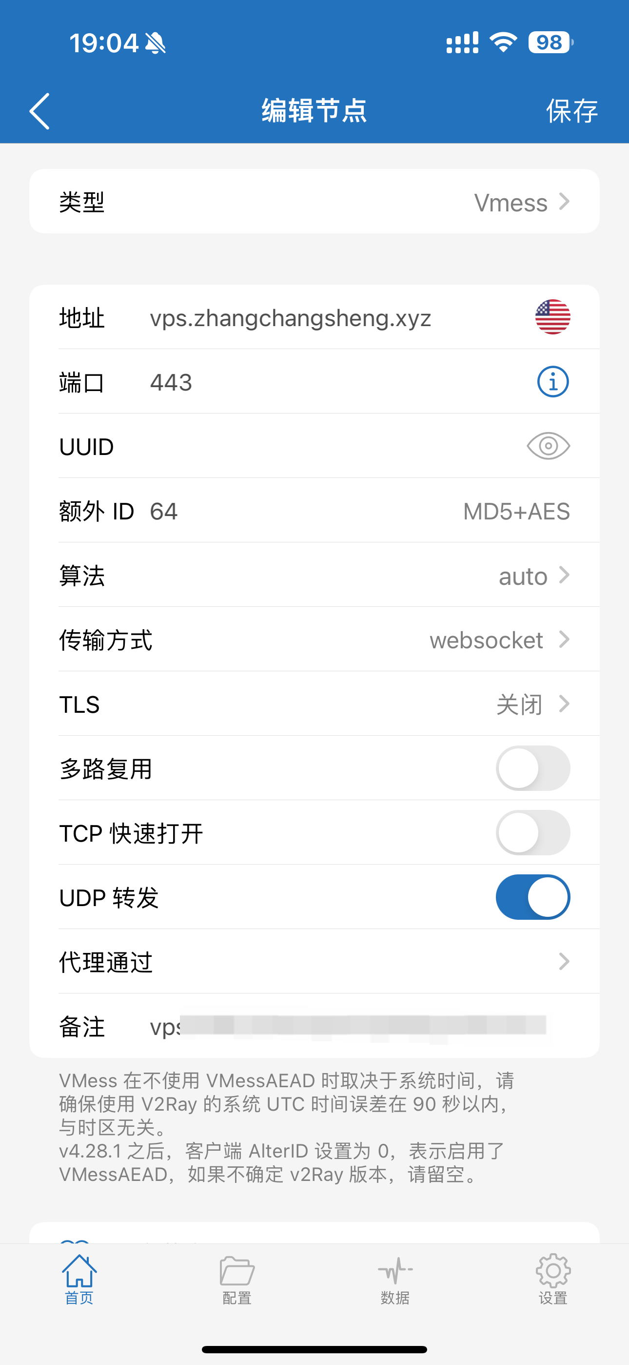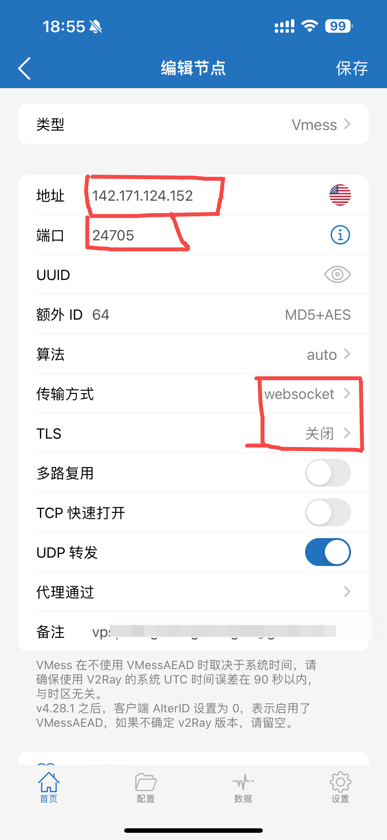 点击后面的感叹号,编辑节点,地址改为在NPM上配置的域名地址,端口改为443,传输方式选择ws,ws中的Host填写NPM上的域名,路径填写入站列表里的路径,开启tls,备注可以改也可以不改