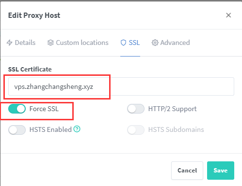 点击Proxy Host 添加一个Proxy Host.域名需要提前解析到VPS,如果是刚配置的话,可能域名解析要等一会儿才会生效,具体根据域名解析服务商确定.