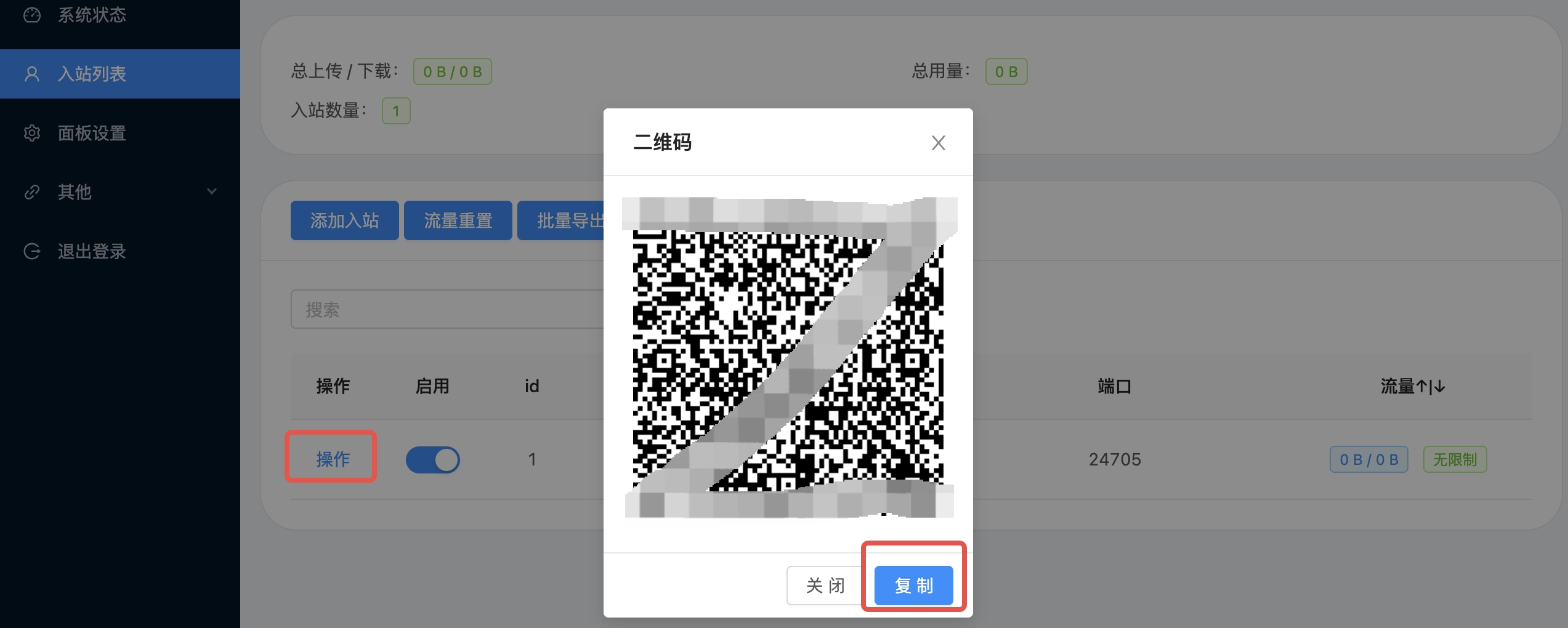 在入站列表点击操作,复制会得到一串连接,导入进去后不能直接使用,还需要改一些配置