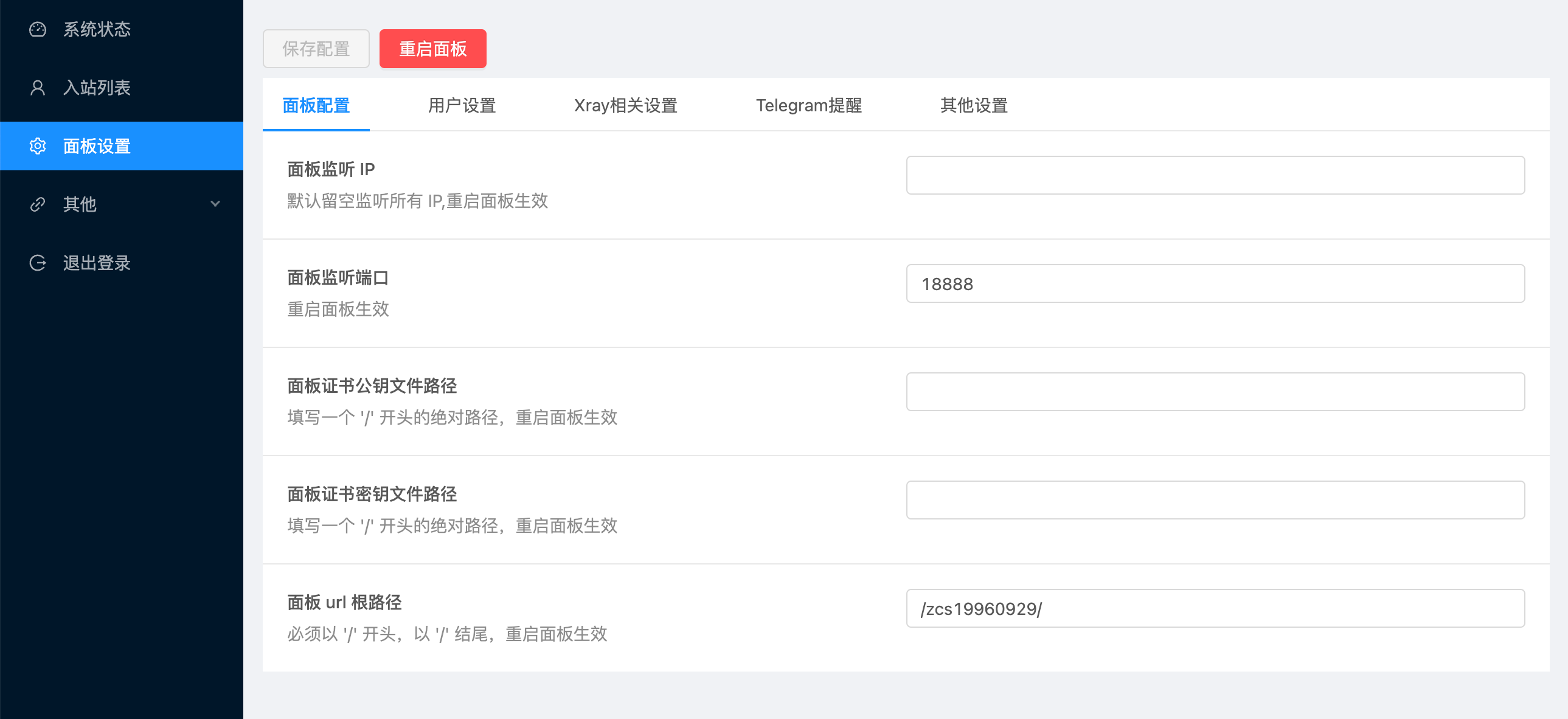 保存配置信息,并重启面板